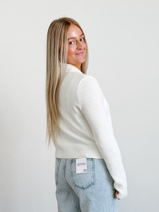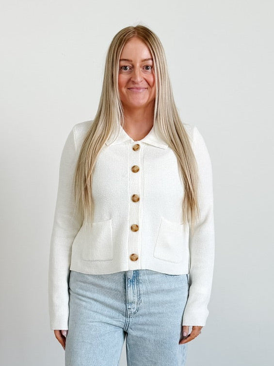 Collared Button Down Long Sleeve Knit Cardigan in Ivory