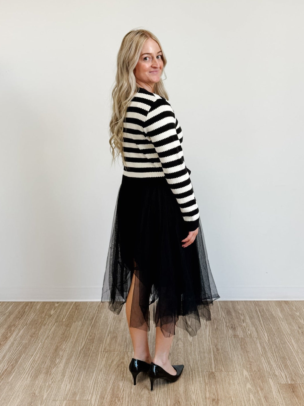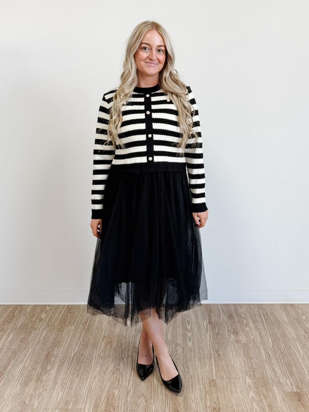 Twirl into the spotlight in this charming stripe cardi tulle skirt dress! The classic striped cardigan pairs perfectly with a voluminous tulle skirt for an effortlessly chic look that's equal parts sweet and sophisticated. Layer it, style it solo, or dress it up for any occasion—this versatile piece brings playful elegance to your wardrobe. Perfect for anyone who loves a touch of whimsy with their everyday wear.