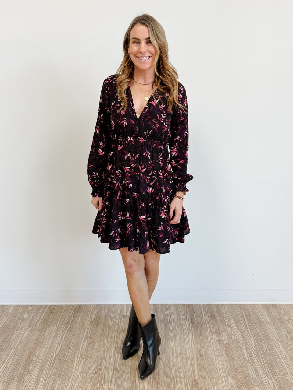 Effortlessly charming, this tiered button dress features cascading layers that dance with every move. The delicate trailing leaf details add a whimsical touch, while functional buttons down the front make getting dressed a breeze. Perfect for layering or wearing solo, this versatile piece transitions seamlessly from casual days to special occasions. A playful wardrobe essential that brings movement and personality to your style.