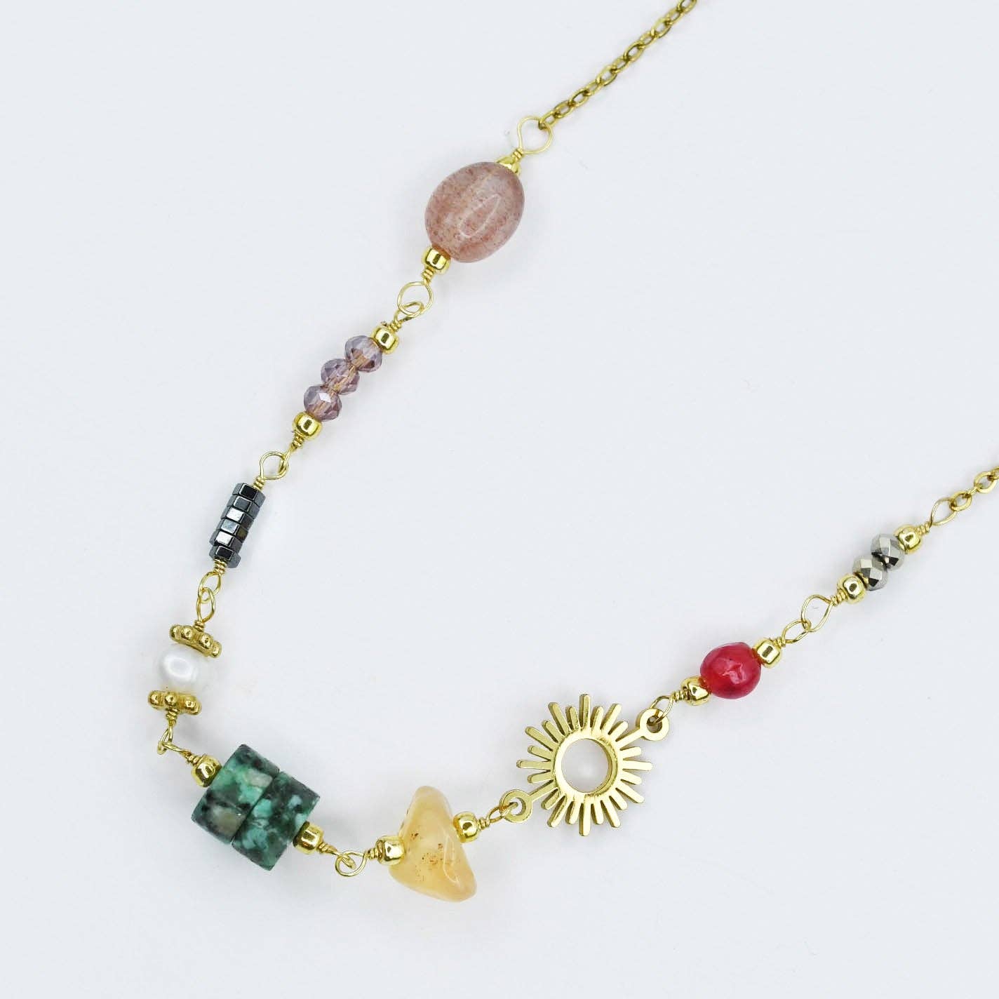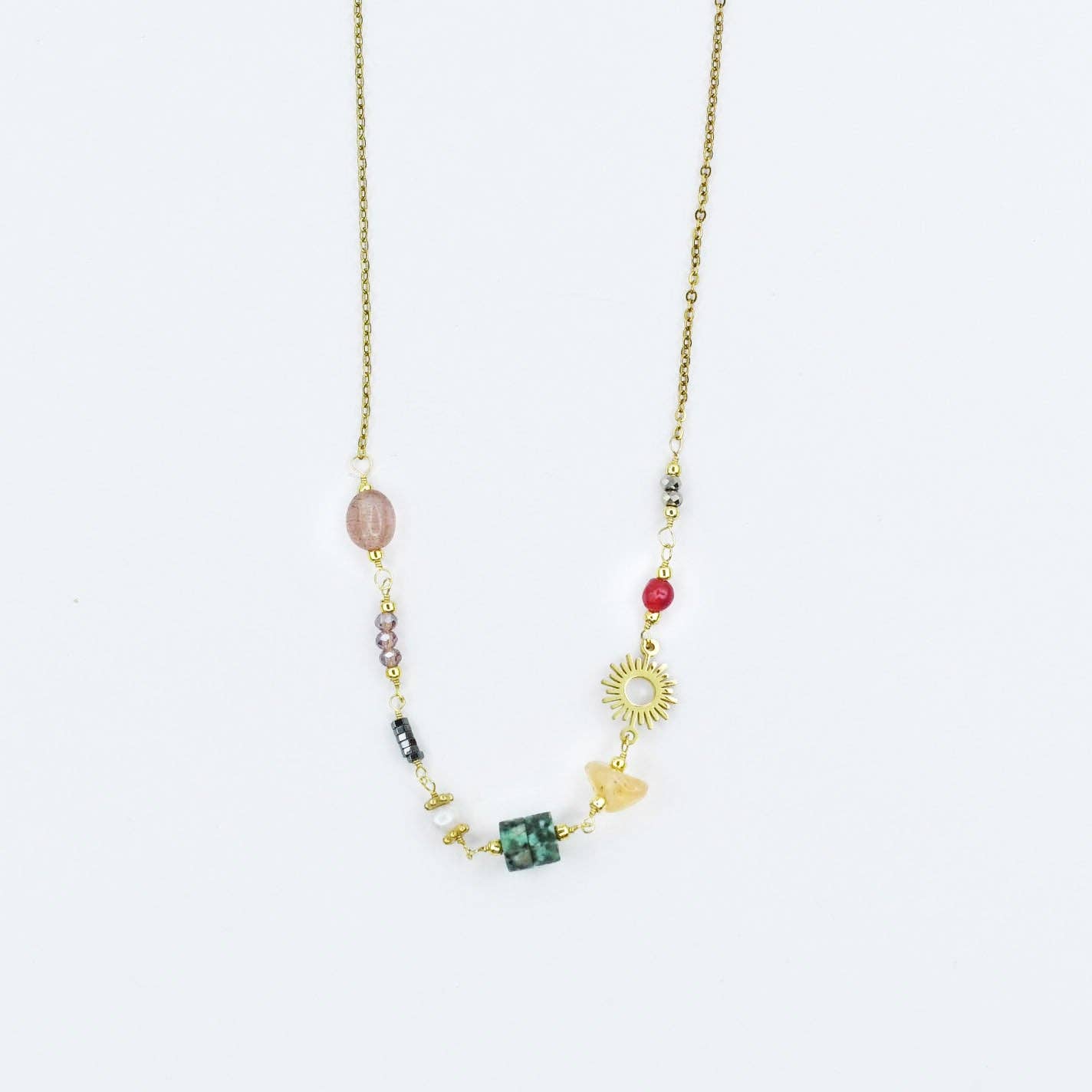 * Brighten your style with this necklace. * Designed with a joyful mix of colorful beads, unique gemstones, and a radiant golden sun charm. This necklace is full of personality and charm.