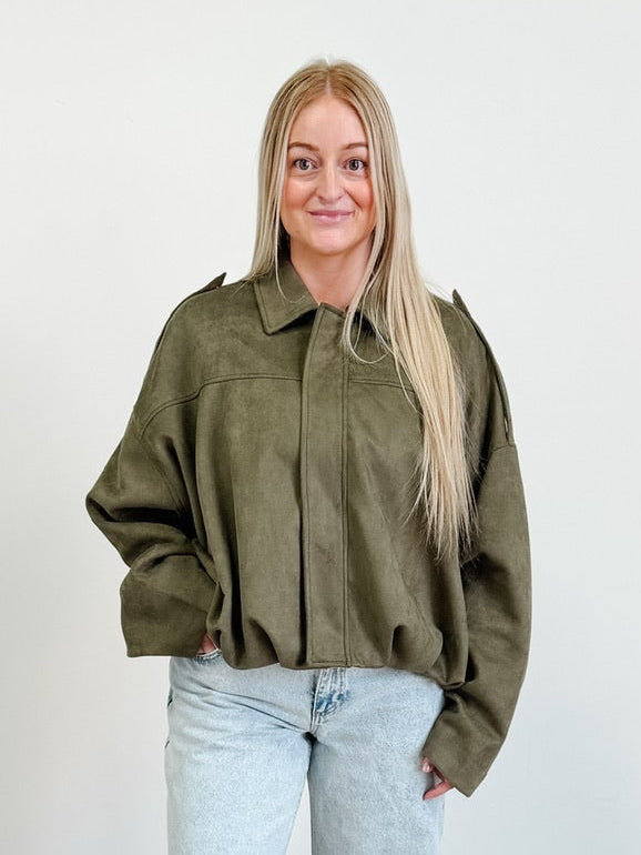 Casual Collar Faux Suede Cropped Jacket with Zipper Front in Army Green