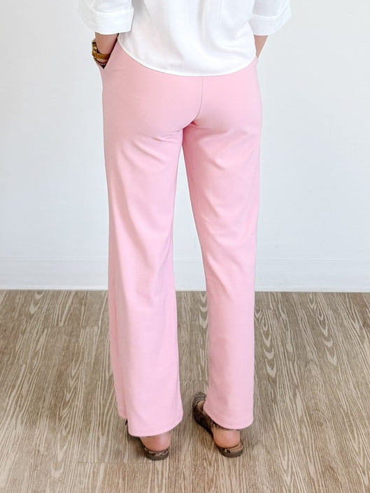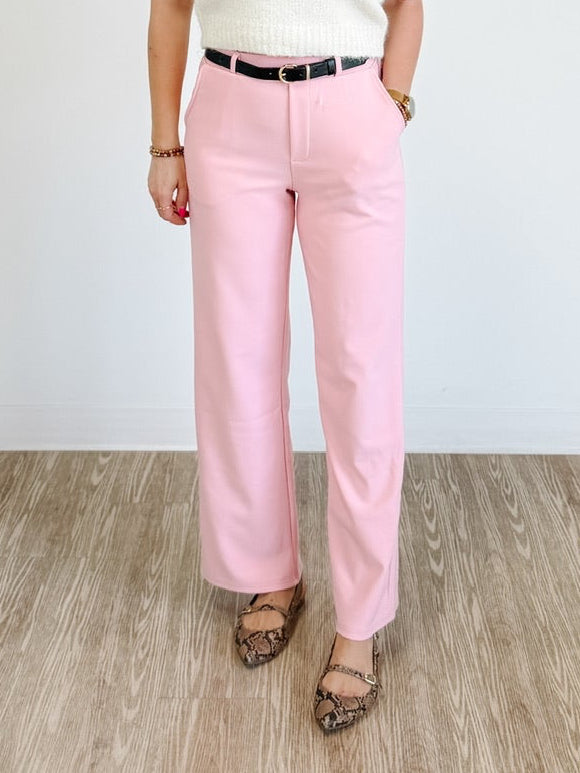 High Rise Wide Leg Scuba Knit Belted Pants in Powder Pink