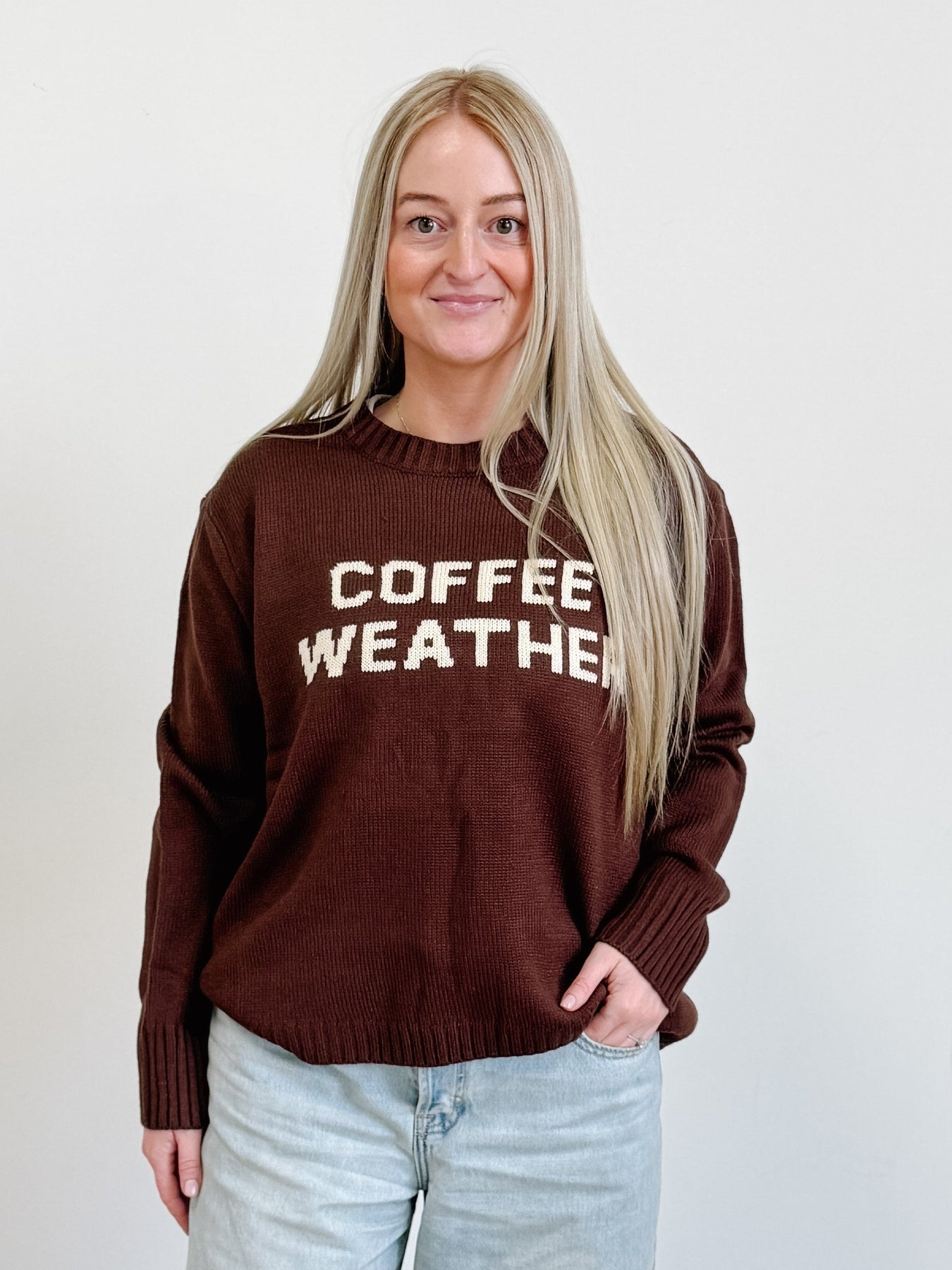 Wrap yourself in cozy vibes with this Coffee Weather Sweater—the perfect excuse to stay snug indoors with your favorite warm beverage. Soft, comfortable, and undeniably charming, it's designed for those crisp days when all you want is comfort and caffeine. Whether you're curling up with a book or running errands, this sweater pairs perfectly with your go-to coffee mug. Because let's face it, the best kind of weather is coffee weather.