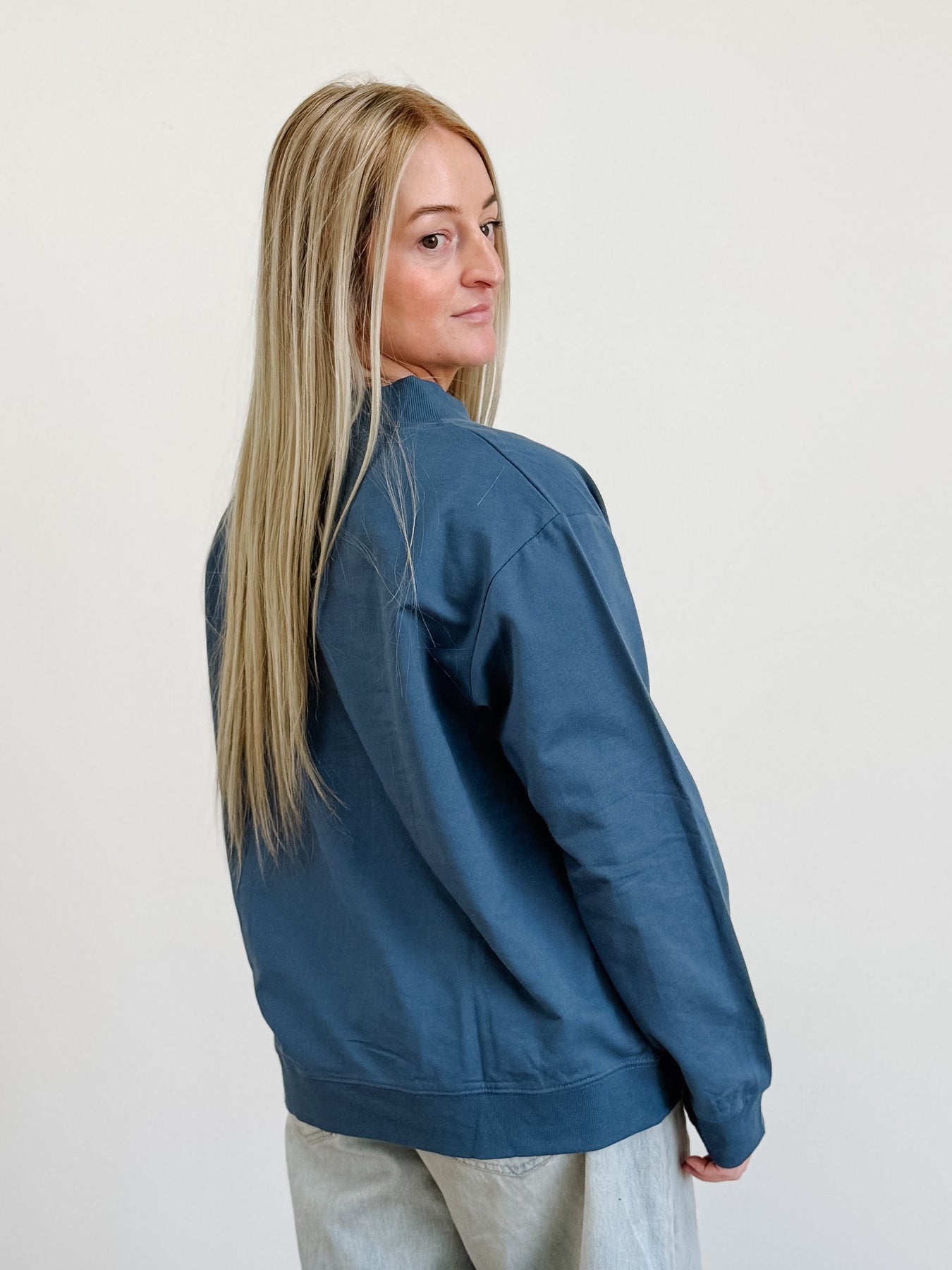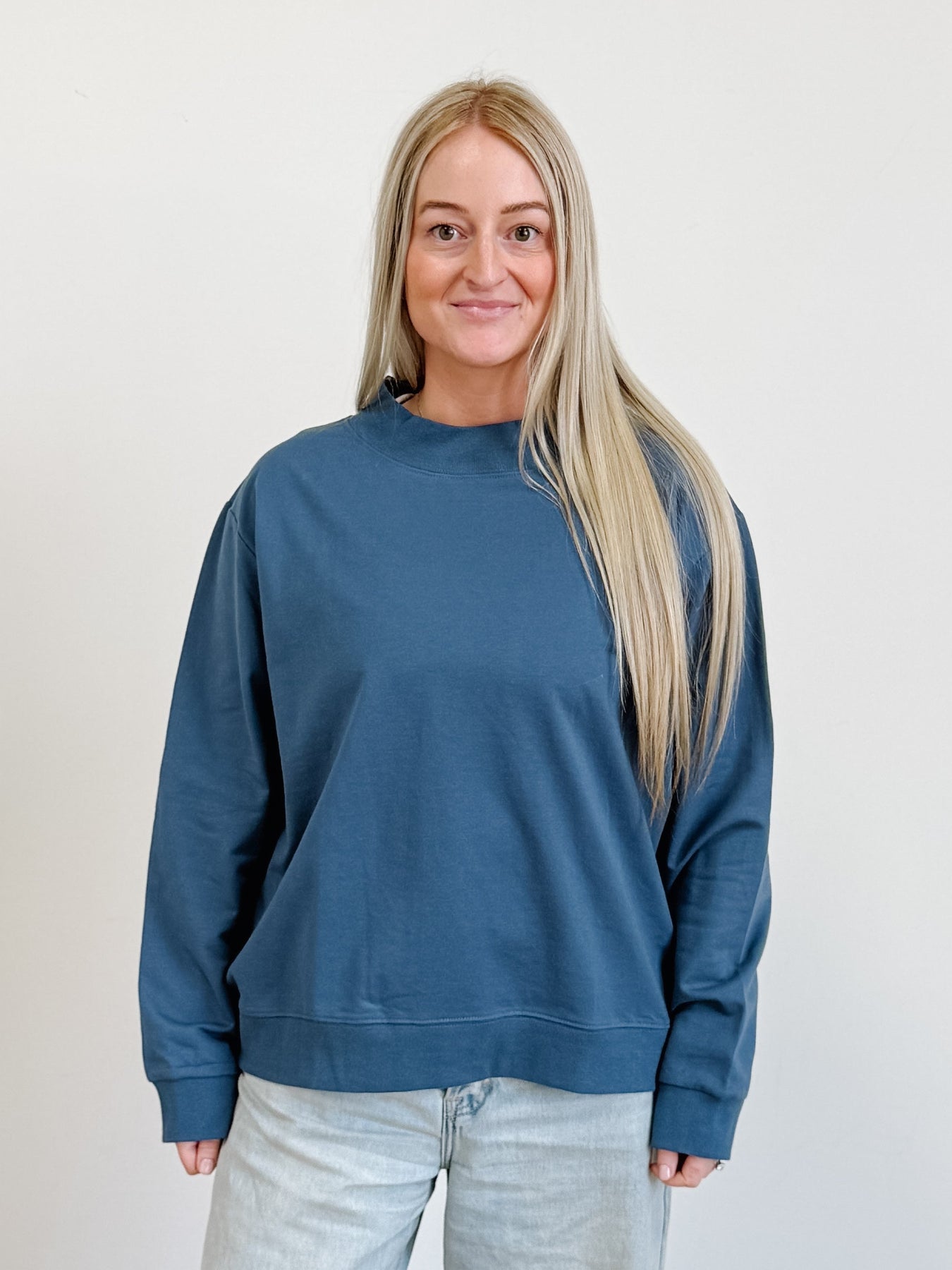 Mock Neck Terry Sweatshirt With Oversized Neck Band in Denim Blue