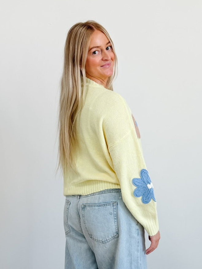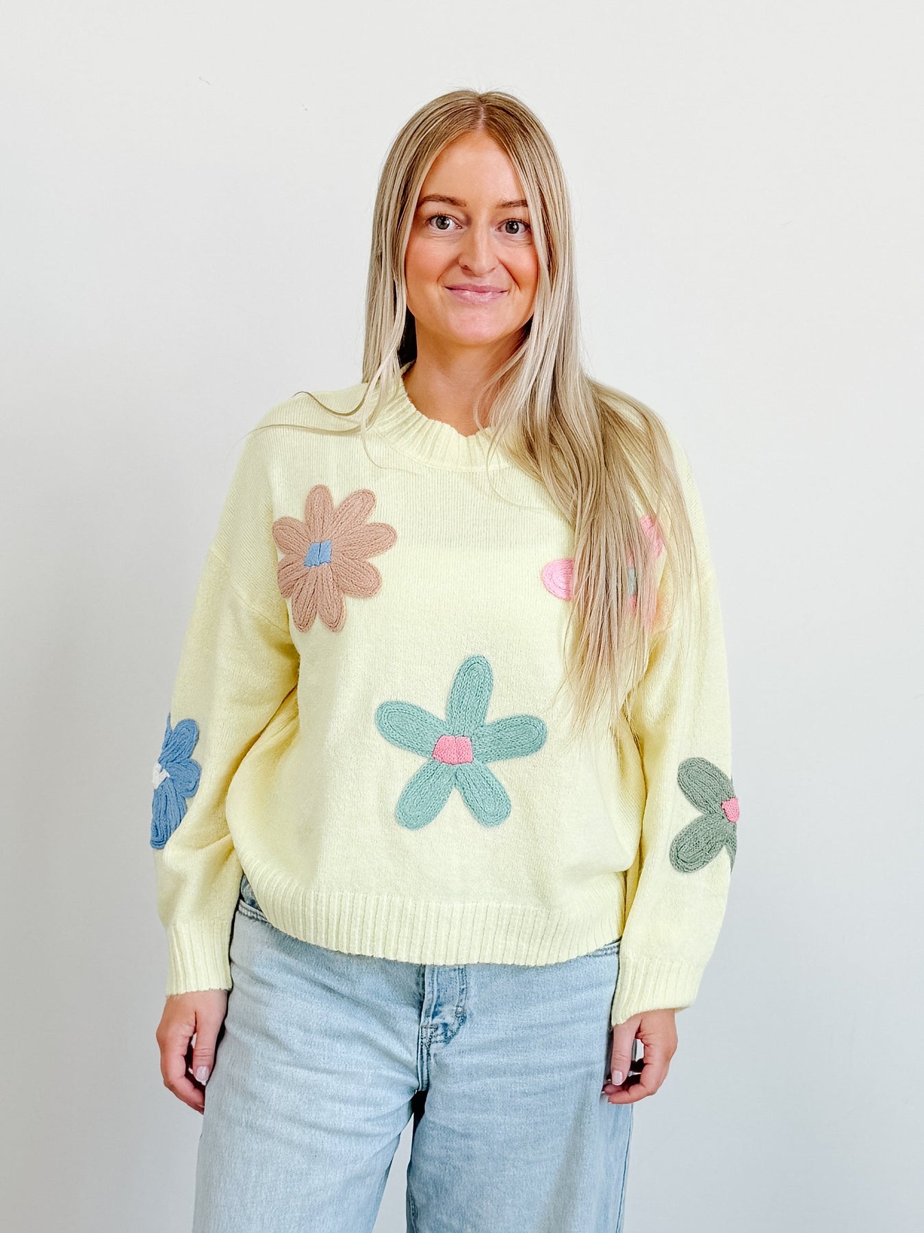Brighten your wardrobe with this charming knit pullover, featuring delightful crochet floral details in a vibrant mix of colors. The soft, cozy knit fabric makes it perfect for layering through the seasons, while the playful crochet accents add a handcrafted touch that stands out from the ordinary. Whether you're dressing up for brunch or keeping it casual, this pullover brings instant personality and warmth to any outfit. A fun, feel-good piece that celebrates color and creativity.